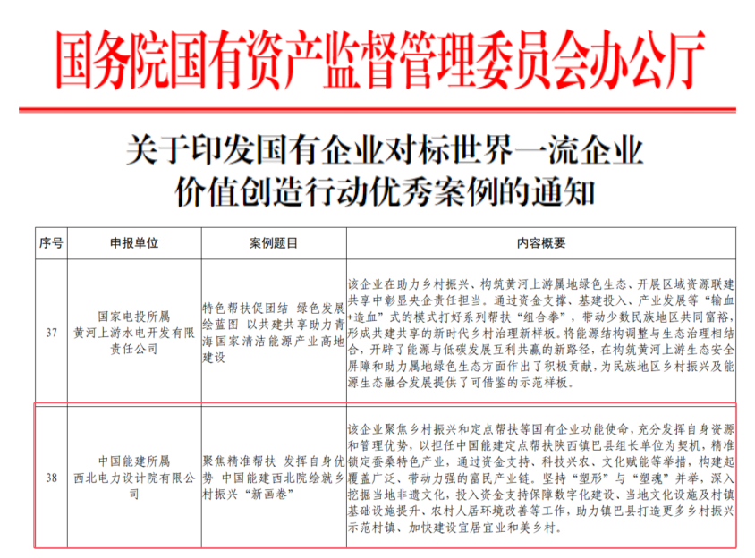 news近日,國務院國資委印發《國有企業對標世界一流企業價值創造行動優秀案例》,評選出6個重點領域,共計40個代表性強、創新性突出、推廣價值高的優秀案例。中國能建所屬西北電力設計院有限公司(以下簡稱西北院)選送的《聚焦精準幫扶 發揮自身優勢 中國能建西北院繪就鄉村振興“新畫卷”》成功入選推動共建共享領域的優秀案例。